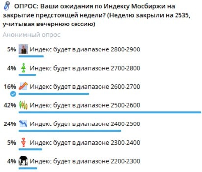 🎤 На прошлой неделе было 4 важных опроса! Проверим, кто оказался Вангой: 1️⃣ Опрос про ожидания по Индексу Мосбиржи! Неделю закрыли на уровне 2686, сделав за неделю +151 пункт! 16% - ВАНГИ! Но большинство (42%) ожидали рынок в боковике - в диапазоне 2500-2600. При этом 24% ждали индекс в диапазон 2400-2500! То есть пессимизм прошедшей недели был высокий, но Трамп со своим планом внес свои коррективы. 2️⃣Опрос по паре юань-рубль! Юань-рубль закрылся на уровне 11,09, сделав за неделю -2,51%. 12% - Ванги! Большинство (41%) ожидали юань в диапазоне 11,36-11,64. 34% ждали снижение в диапазон 11,13-11,36! То есть оптимистичные настроения не оправдались! 3️⃣Опрос по инфляции! Инфляция составила +0,11% за неделю (Было +0,09%), индекс при этом на вечерней сессии упал.. 23% - Ванги! 4️⃣ Опрос про переговоры в Турции! 28% - Ванги! Они оказались правы - переговоров никаких не было! Зеленский встретился с Умеровым и Эрдоганом и на этом всё закончилось. 🚗 МОЛОДЦЫ! Проведем несколько опросов