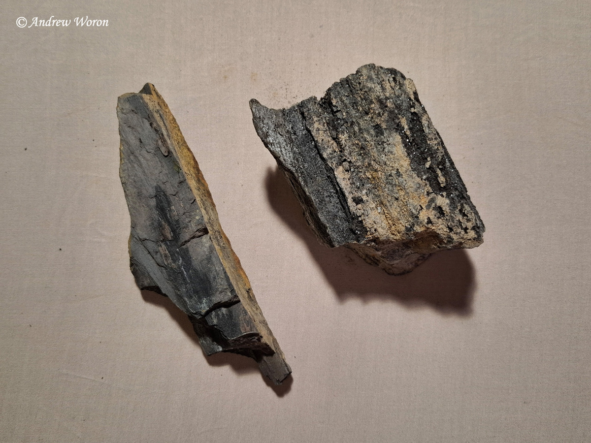 С этой знаменитой реки в республике Адыгея обычно, для коллекции, привозят плитки глаукоинта, на которых отпечатались следы древней жизни: рыбы, насекомые, растения. Но мне знакомые любители палеонтологии и геологии из города Хадыженска, прислали пару кусочков окаменелого дерева и несколько образцов местных пород и минералов. А за рыбаками и муравьями как-нибудь съезжу туда сам. К какому виду принадлежала эта углефицированная древесина определить, наверное, невозможно. Возможно лишь глубокий химический анализ и микроскопическое исследование древесины это скажет. Но мне это не важно. Главное с Пшехи теперь тоже есть пара кусочков. Минералы и породы, пришедшие вместе с окаменелым деревом. Не всё имеет какую-то особую ценность, но меня устраивает. Нечто белое. Пока не определил, но что-то среднее между кахолонгом и алебастром. Видны следы натёчности, и мягкий, как кальцит. Со временем разберусь. Два кусочка пшехского кварца для образца. Левый – с неплохой такой иризацией, правый – с мелки