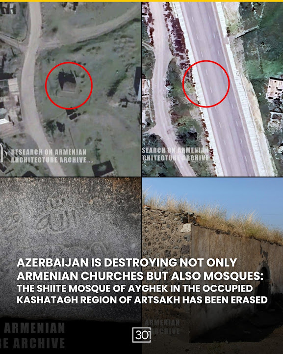 Азербайджан стёр с лица земли еще один исторический памятник в оккупированном Арцахе (Нагорном Карабахе), на этот раз мусульманскую - шиитскую мечеть, подчеркнув чёткую картину культурного разрушения, направленного против различных конфессий и многовекового наследия. Спутниковые снимки высокого разрешения подтверждают факт сноса мечети Айгек конца 19-го века в оккупированном Кашатагском (Лачинском) районе (см.верхний снимок). Построенная в 1890 году, эта мечеть была одним из немногих сохранившихся образцов шиитской архитектуры того периода. Азербайджан разрушил его в период с января 2021 по апрель 2024 года, чтобы расчистить территорию для автодороги Худафарин–Кубатлу–Бердзор, несмотря на то, что армяне десятилетиями сохраняли его и восстанавливали другие исламские объекты по всему Арцаху. В течение почти тридцати лет армянского правления исламские памятники Карабаха рассматривались как часть общего наследия региона. Армянские власти сохранили несколько мечетей персидской эпохи и полно