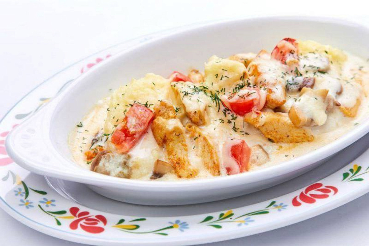 Нежное куриное филе, томленое в густых сливках с болгарским перцем и расплавленным сыром, создает гармоничное и сытное блюдо.