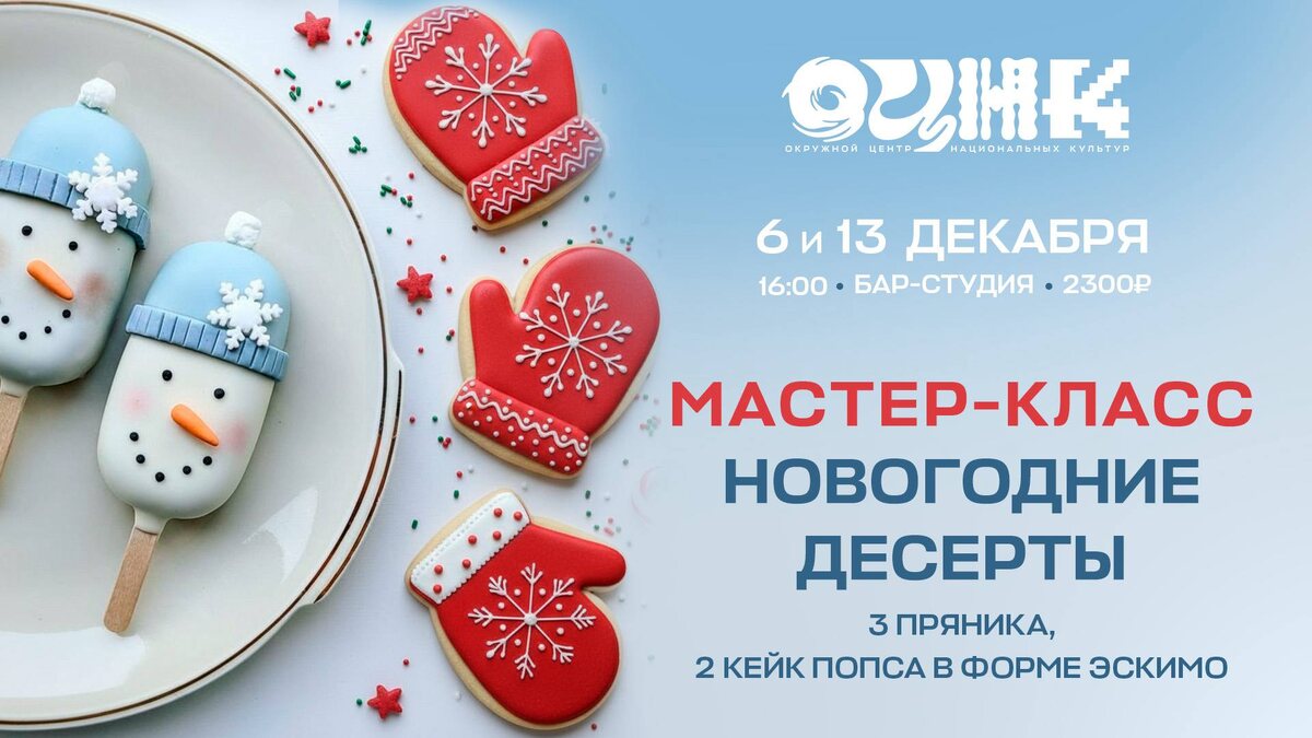 Создайте Новогодние подарки своими руками ✨ Скоро Новый год, а это значит, что пора создавать настроение! ❄️ Окружной Центр национальных культур приглашает на серию уютных предновогодних мастер-классов, где вы сможете сделать своими руками потрясающие украшения и подарки для близких за кружечкой вкусного чая и под лучшие новогодние фильмы, мультфильмы. Что вас ждет: 🔵«Новогодние десерты» - готовим 3 пряника и 2 кейк-попса в форме эскимо. Дата: 6 и 13 декабря Купить билет тут и тут 🔵«Пряничный домик» - готовим красивые и новогодние пряничные домики. Дата: 20 декабря Купить билет тут 🔵«Новогодний торт и композиция» - готовим новогодний торт в виде баночки икры и создаем рождественскую композицию со свечой. Дата: 27 декабря Купить билет тут Количество мест ограничено! Успейте забронировать свое место по ссылкам выше! 👆🏻 Давайте вместе наполним этот Новый год теплом и творчеством! 🩵 #Салехард #ОЦНК #МастерКласс #НовыйГод