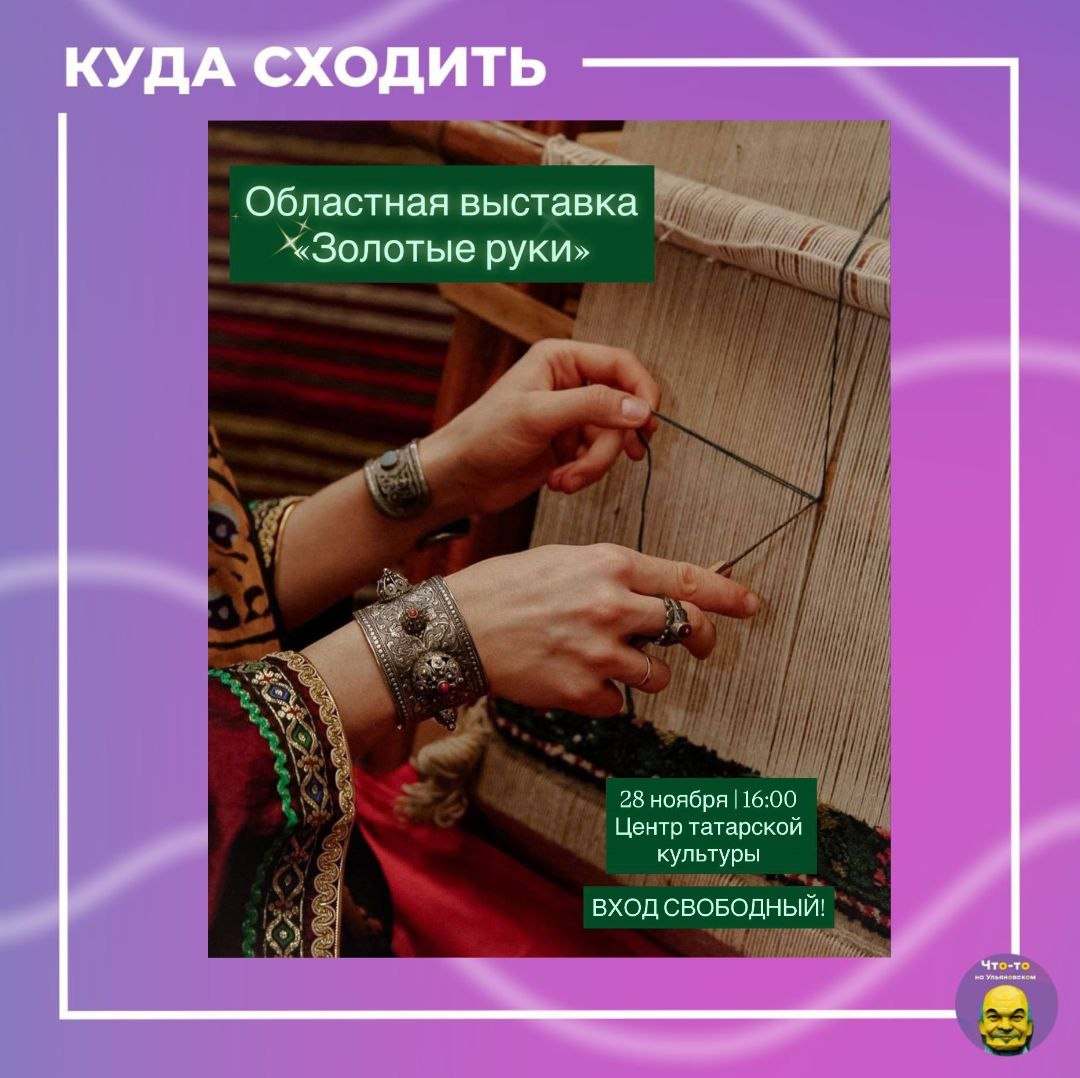 Выставку мастеров «ЗОЛОТЫЕ РУКИ» ✨ Это шанс увидеть воочию то, что составляет душу и гордость нашего народа. В одном месте соберутся сокровища, созданные с любовью и мастерством: ✨ Изысканная вышивка и сияющее золотное шитье, за которым стоят часы кропотливого труда. ✨ Великолепные ювелирные изделия и самобытные украшения из кожи. ✨ Завораживающая кожаная мозаика и традиционная керамика. ✨ Сложнейшее узорное ткачество, в котором каждый орнамент — это история. 📅Когда: 28 ноября в 16:00 📍Где: Центр татарской культуры, пр. Нариманова, д. 25 👍Вход свободный #куда_пойти_ул