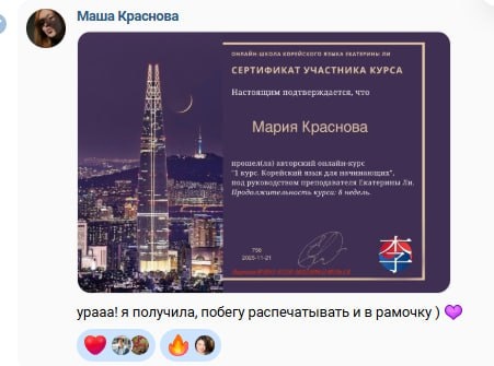 Как же приятно видеть ваши результаты! Не так давно завершился 33-й поток 1 курса, и ученики уже активно записываются на 2-й курс, который стартует 24 ноября. Нам очень приятно читать их теплые отзывы о пройденном обучении. 🥰 ❗️1 декабря стартует новый 34-й поток 1 курса и на него сейчас невероятно вкусная скидка приуроченная к ноябрьским распродажам. Не пропустите. Записывайтесь на курс для начинающих со скидкой 20% прямо сейчас на сайте - koreanli.ru/kurs1korean
