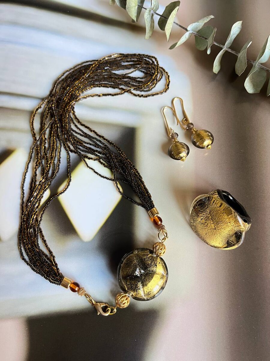 Необыкновенно красивый комплект украшений из муранского стекла✨ Колье на венецианском бисере Винтаж 9 нитей Длина:50-52 см 8500₽ Кольцо с золотом из муранского стекла На фото 17,5-18 размер 5500₽ #фотосессиинановыйгод #украшения🤩 #муранскоестекло