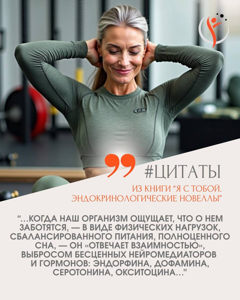 «…Когда наш организм ощущает, что о нем заботятся, — в виде физических нагрузок, сбалансированного питания, полноценного сна, — он «отвечает взаимностью», выбросом бесценных нейромедиаторов и гормонов: эндорфина, дофамина, серотонина, окситоцина. Это очень мудрый механизм, заложенный природой для того, чтобы мы продолжали прекрасный путь позитивных перемен и имели достаточно сил и мотивации, чтобы не свернуть с него…» Делюсь цитатой из моей книги «Я с тобой. Эндокринологические новеллы» Читать книгу