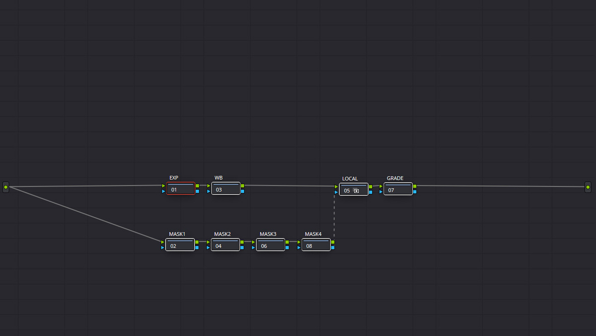 От последней ноды с маской протягиваем альфа канал к ноде, в которой планируем производить дальнейшие коррекции (Здесь "Local"). Выглядеть такая нодовая структура будет примерно вот так.