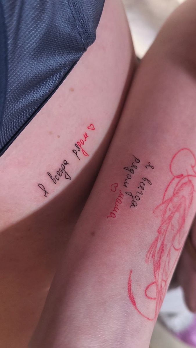 Когда любовь становится линией на коже… Сегодня у меня невероятно трогательная история: мама и дочь сделали парные надписи — почерком друг друга. 🌸 У мамы — под грудью, самое бережное место, как символ того, что дочь всегда рядом, всегда в сердце. 🌸 У дочери — на руке, чтобы тепло маминых слов было с ней в каждом движении, каждый день. Акцент красным цветом — как ниточка связи между ними, тонкая, но нерушимая. Такой простой текст, но сколько в нём чувств. Сколько любви, поддержки и тихой нежности. Именно ради таких моментов я люблю свою работу — когда тату становится не просто рисунком, а историей семьи 🤍 Спасибо вам за доверие и за возможность прикоснуться к вашему маленькому чуду. ❤️ Я всегда рядом — и это правда, которую теперь не стереть. #парнаятату #татудлямамыидочери #семейнаятату #татунадпись #tattoo #kleinksenia #телокакхолст #татумастер #любовьнавсегда