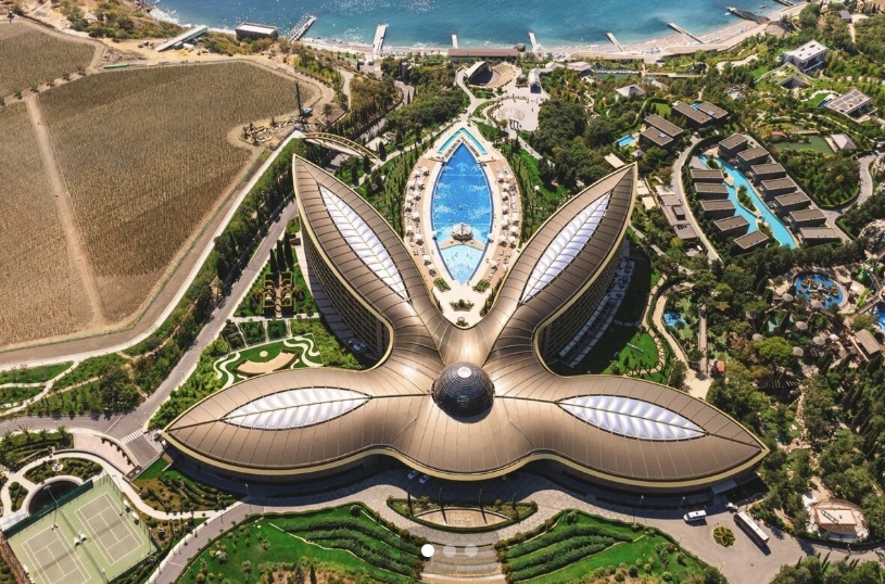 Проект грандиозного здания курорта Мрия представляет собой цветок лотоса с куполом посередине – Лотос символизирует преображение и духовный рост.