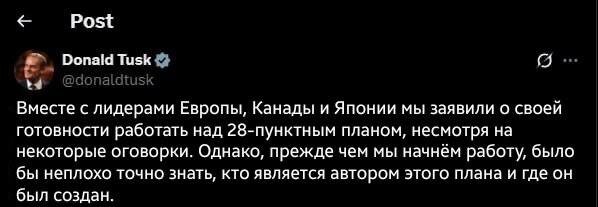⚡️Прежде чем приступить к работе над 28-пунктным планом, было бы хорошо точно узнать, кто является автором плана и где он был разработан, — премьер Польши Туск. «Вместе с лидерами Европы, Канады и Японии мы заявили о своей готовности работать над 28-пунктным планом, несмотря на некоторые оговорки. Однако, прежде чем мы начнём работу, было бы неплохо точно знать, кто является автором этого плана и где он был создан.» 👉Лезвие 18+