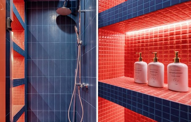 Мини-санузел с настроением, который не потерял в удобстве В проекте студии площадью 20 кв. м дизайнеры из Kogan Design Studio стремились добиться максимального комфорта даже на самых маленьких участках. Санузел в этой квартире получился настоящим сюрпризом: он не просто отвечает бытовым задачам, но и играет на контрастах. В интерьере использованы смелые приемы, которые доказывают: даже технические зоны могут быть выразительными и запоминающимися. Ванная комната сразу задает настроение: насыщенный коралловый и глубокий синий — нестандартное, но эффектное сочетание. Стены, потолок и ниши в душевой выложены мелкой мозаикой, что создает ощущение графичности. Благодаря подсветке каждая ниша светится мягким красным, добавляя интерьеру театральности. Зеркало на стене напротив входа визуально удваивает глубину комнаты. Отражение продолжается в коридоре, создавая «эффект портала»: прием помогает стереть границы и сделать миниатюрный санузел менее тесным. Этот же принцип работает и в душевой, гд