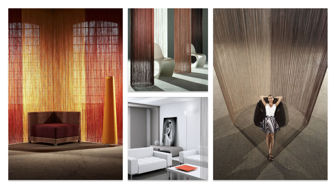 Если изделия нужны для зонирования, лучше отталкиваться от типа крепления, конфигурации комнаты и личных предпочтений. Чаще всего с помощью нитяных моделей создают ширму от потолка до пола. Ширина перегородки может быть любой.
