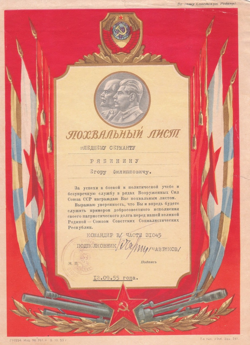 Похвальный лист выданный млЕдшему(!) сержанту Рябинину Е