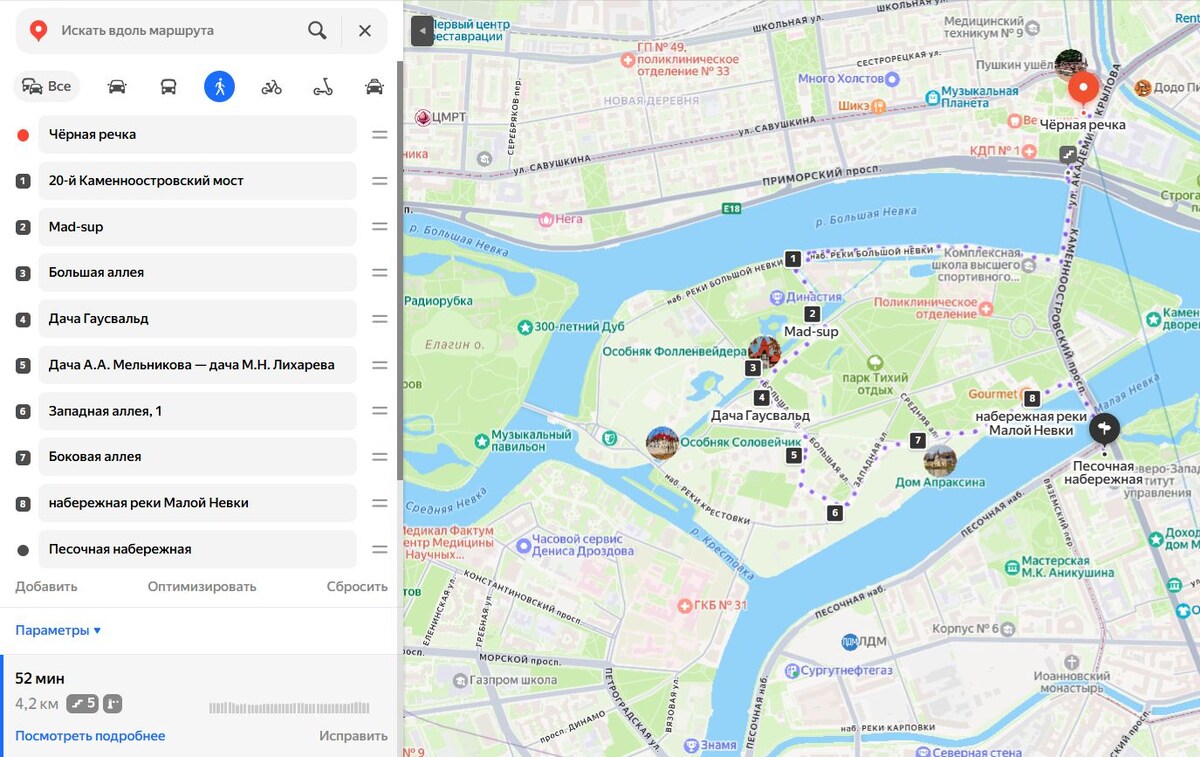 Этот маршрут состоит из трёх частей. Это Первая часть, и она начинается у станции метро Чернышевская и ведёт к Каменному острову. Каменный остров известен тем, что здесь располагались загородные усадьбы и дачи известных петербургских семей XIX–начала XX века. Прогулка по острову позволяет увидеть, как историческая архитектура гармонично вписывается в зелёные уголки города. 1 — Особняк Э.Г. Фолленвейдера