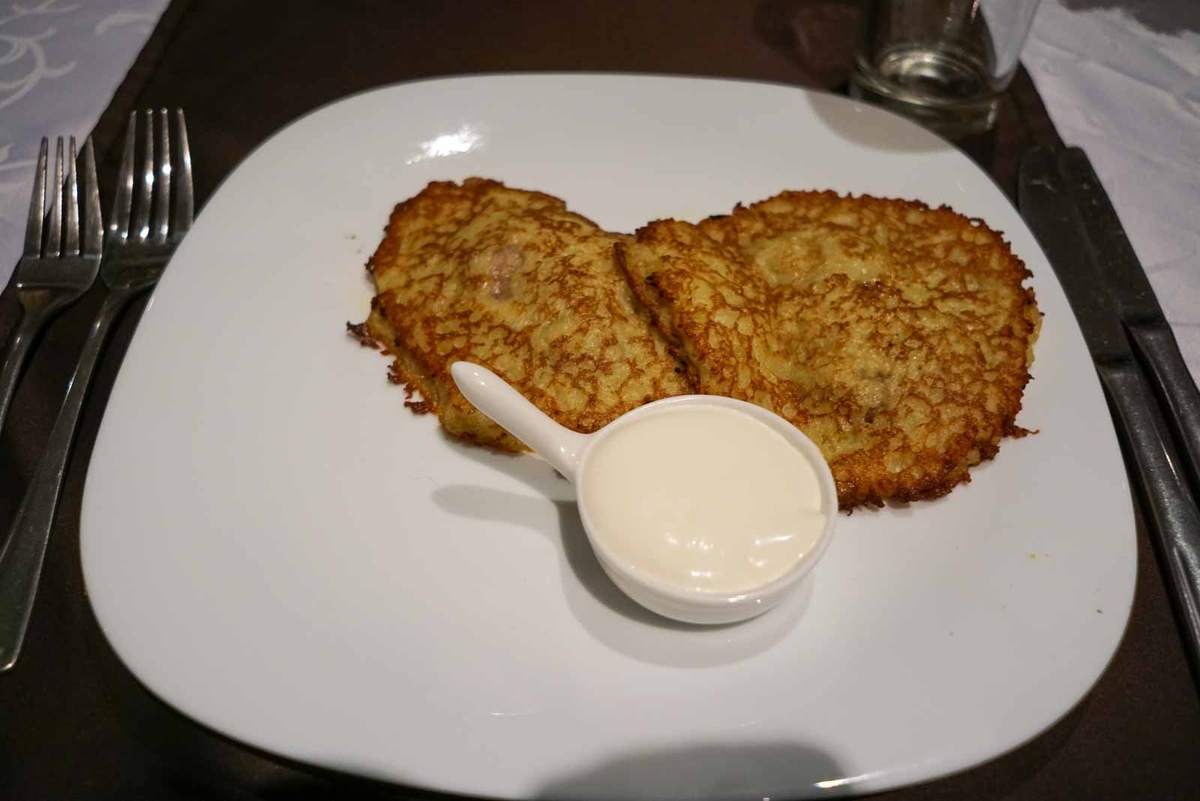 Первая половина моей жизни прошла без драников. Почему-то это замечательное блюдо не входило в наше семейное меню. Можно сказать, что впервые я их распробовал в начале нынешнего века. В 2004 году мы в первый раз поехали в Европу в автопутешествие. Ездили мы примерно два раза в год, и всегда проезжали транзитом Белоруссию. По дороге приходилось обедать в белорусских ресторанах, и один раз мой выбор пал на драники. Я был настолько очарован этим роскошным блюдом, что с нетерпением ждал следующую поездку, чтобы вновь насладиться драниками. Мне казалось такое блюдо просто невозможно приготовить собственными руками. Внезапно подкрался 2020 год, который поставил точку в подобных развлечениях. Я начал скучать по драникам, и решил приготовить их самостоятельно. Оказалось, что в приготовлении - это одно из самых простых блюд. На первых трёх фотографиях представлены различные варианты драников из белорусских ресторанов. Никаких весовых и временных характеристик я привести не смогу, потому что хр