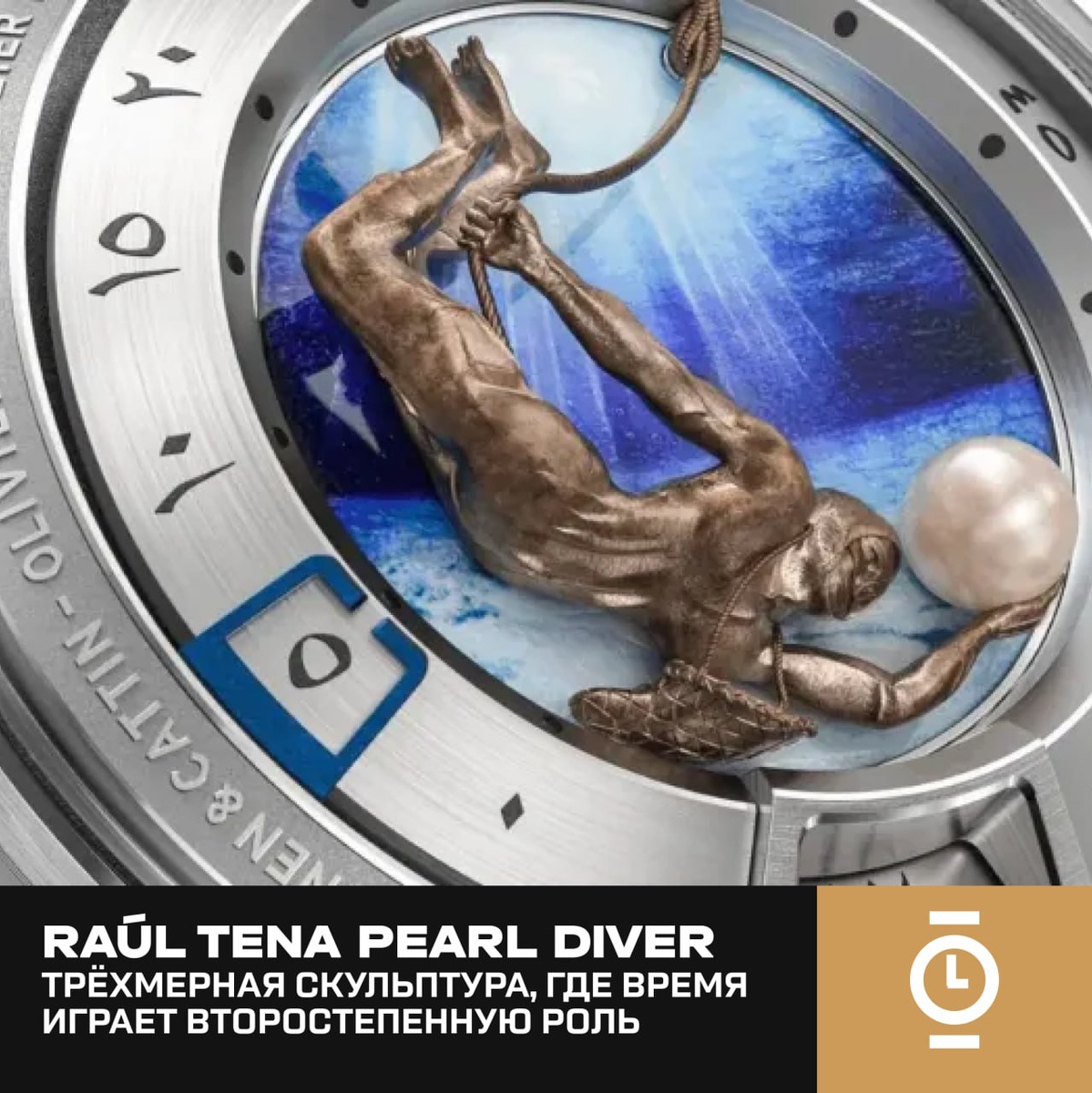 RAÚL TENA ПРЕДСТАВИЛ PEARL DIVER — ТРЁХМЕРНАЯ СКУЛЬПТУРА, ГДЕ ВРЕМЯ ИГРАЕТ ВТОРОСТЕПЕННУЮ РОЛЬ #новости_WD На Dubai Watch Week 2025 состоялась премьера Pearl Diver — трёхмерного арт-объекта испанского инженера и художника Рауля Тены, в котором индикация времени намеренно отходит на второй план. Это первая работа новой серии Art to Watch, созданная за пять лет в сотрудничестве с независимыми швейцарскими мастерскими: Voutilainen-Cattin отвечает за корпус, Télôs Watch SA — за механизм, Comblémine и Atelier Miniare — за декоративные элементы. Стартовая партия включает пять экземпляров, после чего проект перейдёт на полностью кастомные заказы. Лицевая часть Pearl Diver — крупная скульптура из золота, вручную выгравированная Оливье Куном и покрытая патиной. Она возвышается над поверхностью циферблата как самостоятельная миниатюрная сцена. В центре размещена натуральная жемчужина из Персидского залива, подобранная индивидуально. Скульптуру обрамляет эмалевая пластина Atelier Miniare с ру