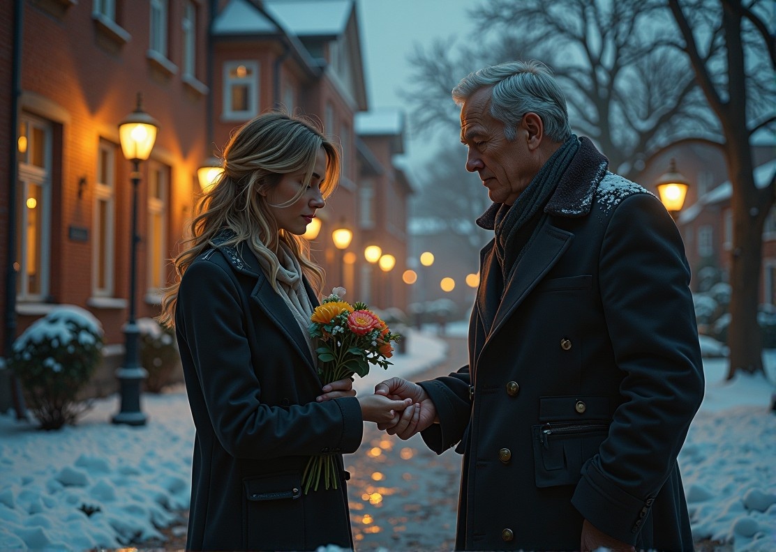 Он протягивает ей букет. Она берёт, даже не оглядываясь. И тут он наклоняется и легко целует её в щёку. Не по-деловому, не «по‑родительски», а привычно, как будто делал это уже не раз.