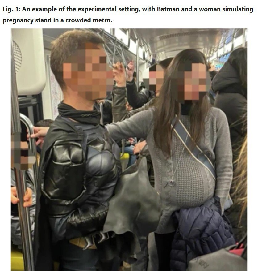 Внимание, Бэтмен заставляет мужиков уступать место беременным женщинам. Это реальное исследование, опубликованное в престижном научном журнале Nature. Называется The Batman Effect. Суть такая: если в вагоне метро присутствует косплеер в костюме Бэтмена, то беременной женщине уступают место почти что на 80% чаще. Думайте.