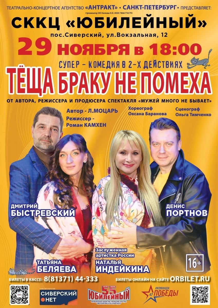 ❗БИЛЕТЫ МОЖНО ПРИОБРЕСТИ В КАССЕ МБУК СККЦ "Юбилейный" и ОНЛАЙН orbilet.ru/event/15288 "ТЁЩА БРАКУ НЕ ПОМЕХА" - весёлая комедия, 2 действия с одним антрактом, автор Лилия Моцарь в МБУК СККЦ "Юбилейный" 29 ноября в 18.00! В семье между мужем и женой появилось некоторое раздражение и охлаждение чувств. Муж мечтает о домашнем уюте, борще и порядке в доме, а жена мечтает об искусстве и гламуре. Борщи варить не собирается, а убираться в доме просто не умеет. Семейное счастье под угрозой, ведь муж может уйти к другой. Но тут в ситуацию вмешивается мама жены - Теща, у которой созревает хитроумный план, как заставить зятя остаться в семье, причем, с чувством вины на всю оставшуюся жизнь. В случае провала плана А, у Тещи есть план В. Что придумала предприимчивая Теща, Вы сможете увидеть в очень смешной, музыкальной комедии. Будет очень смешно. Не смотря, на интригу во время всего спектакля, все кончится очень хорошо и весело. В роля Показать полностью... Наш канал в Max, вступайте Источ