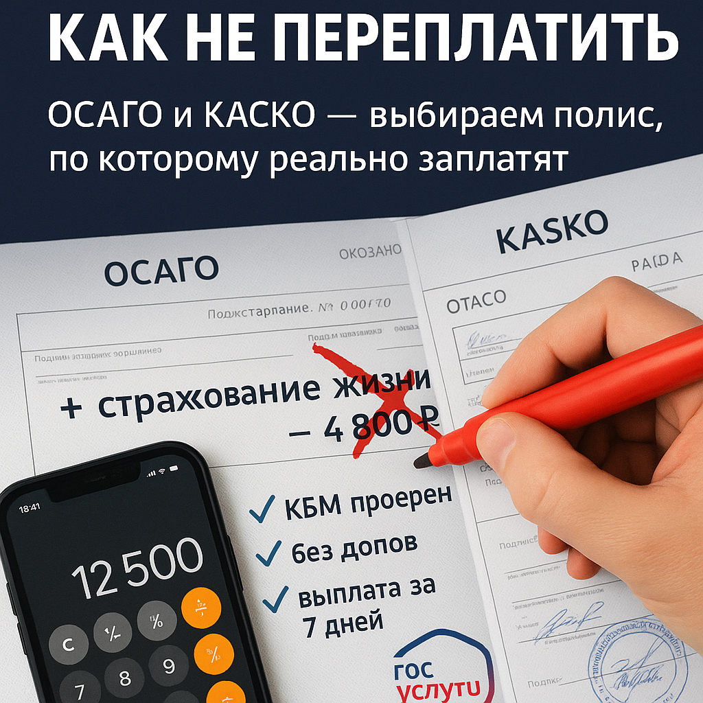 Автострахование: как выбрать лучший полис и не переплачивать Вы заплатили за ОСАГО 12 000 ₽ — хотя по расчету должно быть 8 500. Вас не обманули? Возможно, хуже: вы сами подписали согласие на «допы» — навязанные услуги, которые по закону оплачивать не обязаны. Разобраться в тонкостях ОСАГО и КАСКО сложно, особенно когда страховщики то и дело предлагают «выгодные» опции, а в мелком шрифте скрываются важные ограничения. Ниже — практические советы, как не пожалеть о покупке страхового полиса в 2025 году. ОСАГО: как не переплатить и избежать подводных камней Базовый тариф ОСАГО регулируется Центробанком и достаточно прозрачен. Однако итоговая цена зависит от вашего коэффициента бонус-малус (КБМ), региона регистрации автомобиля и водительского опыта. Чем меньше аварий за последние годы, тем ниже КБМ. Проверить свой КБМ можно на официальных сайтах Центробанка или в приложении «Госуслуги». Если видите «скидку 0%» или подозрительно высокую цену — стоит обратиться к страховщику с просьбой пров