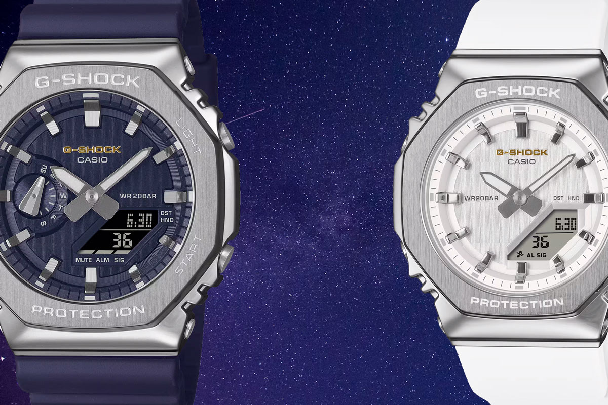 В ноябре CASIO также показали симпатичную коллекцию из четырех моделей для влюбленных под названием «Precious Heart Selection 2025». Подборка включает в себя по две модели серий GM-2110 и GM-S2110 для демонстрации романтических чувств между влюбленными, при этом часы можно будет носить и по отдельности без привязки к «паре». Ну и традиционно, японцы придумали свежий дизайн для новинок — в этот раз стилистика в духе космоса. Дизайнеры называют оформление «космическим», вдохновленным магией звездного неба и незабываемым чувством, когда вы видите на небе падающую звезду. Золотистый логотип G-SHOCK на дисплее напоминает сияющий силуэт звезды, а текстура циферблата символизирует «космическую пыль», дрейфующую в небе. Стальной безель здесь как раз кстати — наличие металла подчеркивает звездный утонченный дизайн моделей. Касиовцы уже не в первый раз практикуют разные типы отделки поверхности в пределах одного корпуса — текстура волоса на лицевой части безеля и зеркальная полировка по перимет