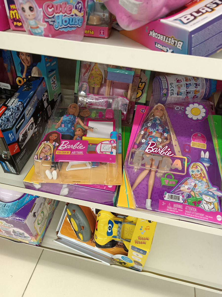 Всем большой привет! Была я сегодня в «Тандеме» в ДМ и ассортимент меня порадовал. Но начнем пожалуй с небольшой шокирующей новости. Все знают магазин Familia? Обычно я там мельком смотрю на подделок и прохожу мимо. А в этот раз там были Барби! И ладно, игровушка, но Экстра тоже была! Сказать что я была удивлена, ничего не сказать! А дальше мы зашли в Детский мир... И понеслось. Барби оказалось много. Этот стенд и ещё сбоку. Довольно милая фэшенка. Ох, эта баскетболистка. Ну нужна она мне, очень нужна! Но тут стоила почти 3000. В интернете дешевле. Интересная Барби. Выглядывает так любопытно. Мне кажется она из фильма? Ну или я ошибаюсь. А это, остальная часть стенда, весь целиком он не влезает на фото. Эта Экстра довольно популярна в сети ДМ. Часто её встречаю. Ещё одна Экстра. Вот это да! Впервые увидела вживую Кена из фильма. У него интересный молд с хмурым лбом, но эта слащавость... Не понравился. Очень хочу Челси, но пока вживую не видела. Только с наборами. Стоит 4000!