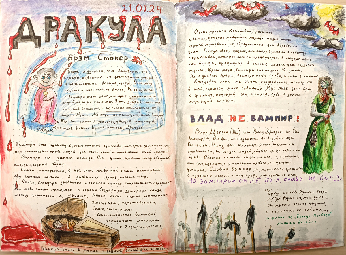 Раньше я думала, что вампиры это слегка коварные, но достаточно добрые и понимающие «вечные люди». Они могут пугать и сеять хаос, не более. Конечно, есть и вампиры очень злые, которые уничтожают людей, но их не так много. У вампиров добрый оскал, они приятной внешности и не сильно отличаются от людей. Например, в мульте «Монстры на каникулах», в фильме «Сумерки» и тд. Как же сильно я удивилась, увидев истинный облик вампиров в книге Брэма Стокера «Дракула». Вампиры это пугающие, очень опасные существа, которые уничтожают всех на своём пути. Либо используют кровь людей для своих целей – пополнение своей армии. Вампиры не знают пощады. Они умны, имеют отпугивающий и омерзительный облик. Книга интересная, в ней очень необычный стиль првествования: мы читаем записки в дневниках героев, письма и тд. Книга, благодаря дневникам и записям самого сокровенного, переносит нас особо сильно прямиком к героям. Создается душевная связь между читателем и и героями. Книга очень сильно наполнена эмоция