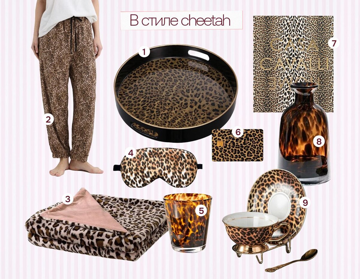 Если вам тоже хочется визуальной ностальгии, вот пятнистая подборка: (1) поднос, (2) домашние штаны, (3) плед, (4) маска для сна, (5) стакан, (6) наклейка на пластиковую карту, (7) коллекционное издание Casa Cavalli Home, (8) ваза, (9) чайная пара