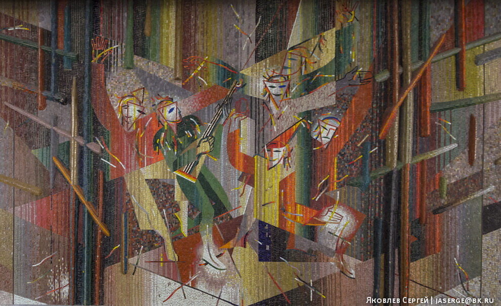 Многие из северодвинских мозаик и витражей спрятаны надежно внутри зданий. Иногда на расширенных экскурсиях по Северодвинску и на Белое море мы делаем целое путешествие по таким ярким местам. Одно из них - Северодвинский драматический театр. Театральные мозаики создавались в 1982/83 гг. целым коллективом авторов. Сохранился их автограф. В первом номере журнала «Театр» за 1985 год архитектор Н. Соловьёва с писала об облицовке стен сложными штукатурками с добавлением стеклянной, каменной и гранитной крошки. В статье упомянуты имена руководителя мастерской И. Михалёва, художника А. Рылеева, авторов проекта Е. Ландау, Г. Аранжереевой, В. Колесник, Г. Павловой.