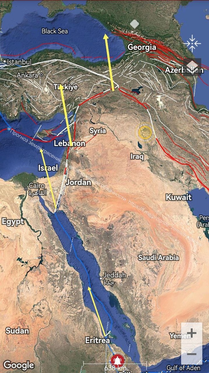 В ответ на пост Так, а вот это уже серьезно 🤨 Имеем повторный ОСТИ по западной границе Аравийской плиты протяженностью почти 3000 км (М8.0+/-0.2). С учетом более ранних картин по зоне, а также недавних картин над Турцией, есть немалая вероятность крупного землетрясения на севере Аравийской или на Анатолийской плите в течение 7 дней. ===== We have a new CSTI along the western boundary of the Arabian Plate with a length of almost 3,000 km (M8.0+/-0.2). Taking into account earlier pictures on the zone, as well as recent picture over Turkey, there is a considerable probability of a major earthquake in the north of the Arabian or Anatolian plate within 7 days.