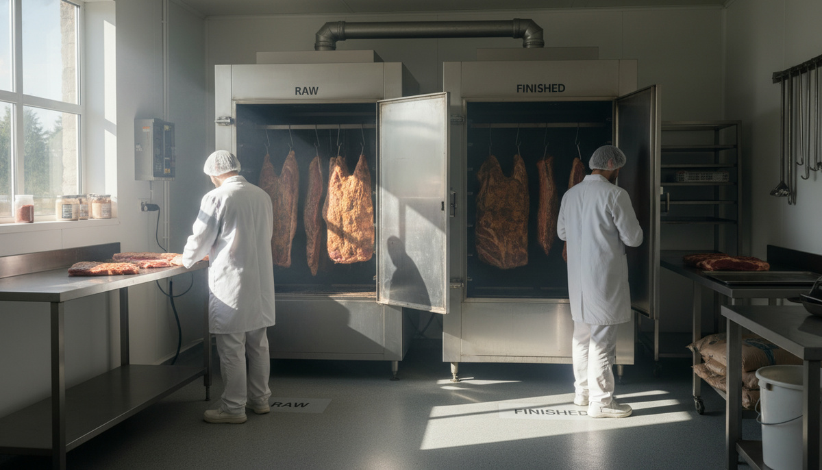Базовая логика — разделение потока «сырьё» и «готовая продукция». Нужно чёткое зонирование: зона приёма сырья, зона первичной обработки, зона копчения, упаковки и хранения. Полы с уклоном и сливами, поверхности моющиеся и стойкие к чистящим средствам, раковины для рук на входе в производственную зону.