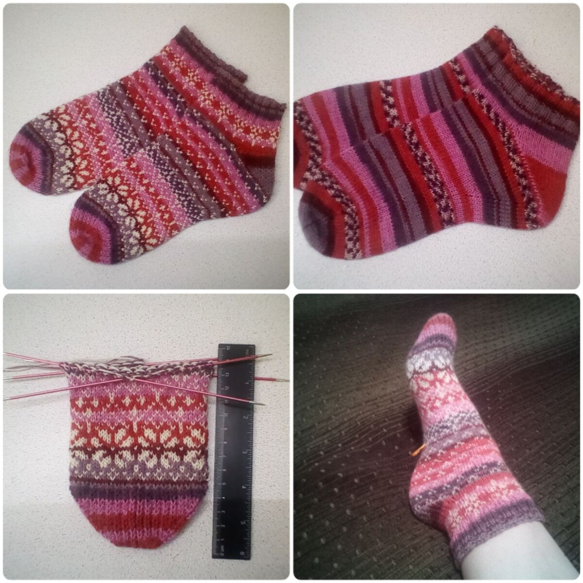 Давно хотела попробовать связать жаккардовые носочки с пяткой Флигля, вот втемяшилась в голову такая идея, и всё тут. Перед тем как браться за жаккардовые, сначала решила связать простые носочки -коротыши лицевой гладью, чтобы вспомнить как это делается и проверить расчёты.