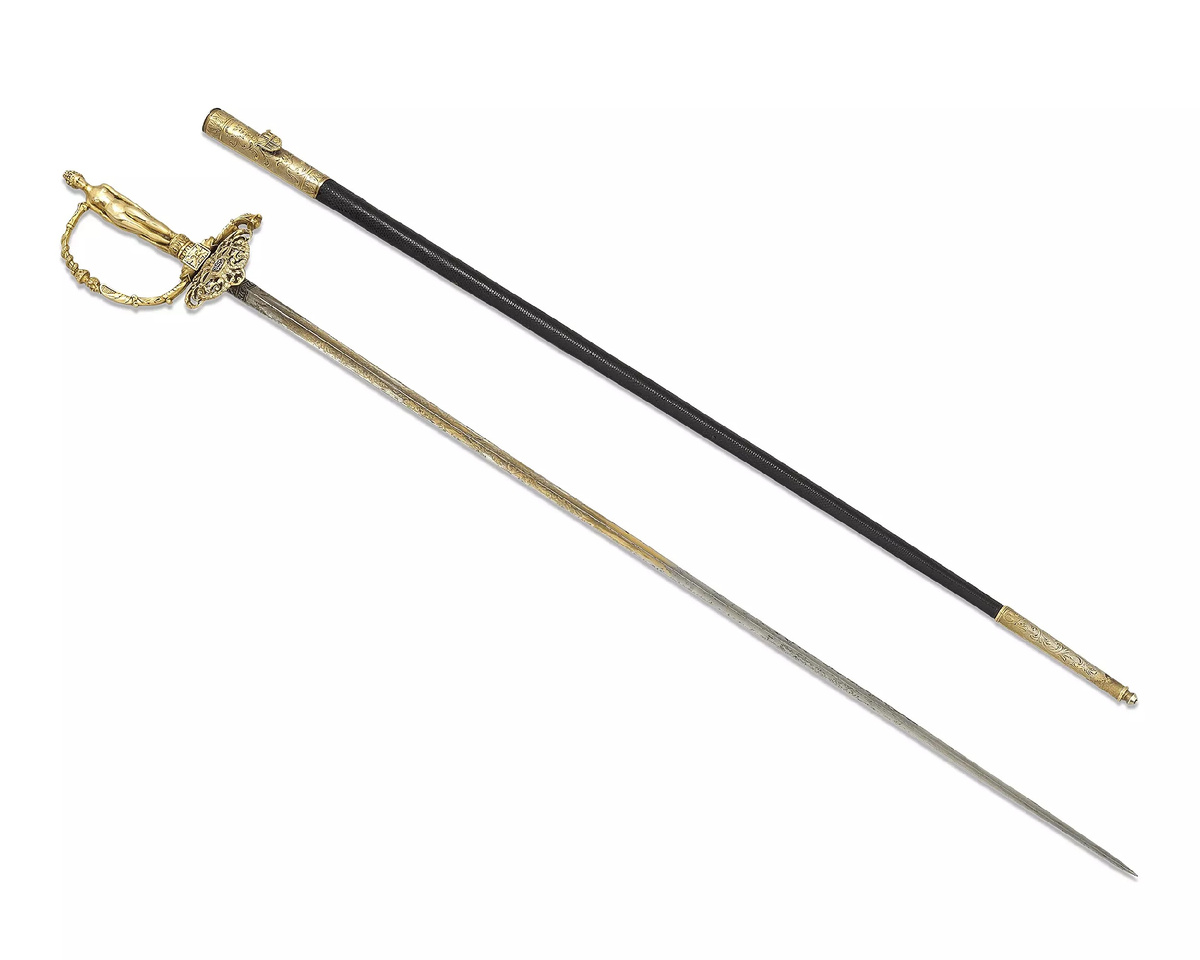 Результат перед вами: шпага, где каждая деталь кричит о любви, роскоши и античных мифах. Золотая кариатида вместо рукояти, свернувшаяся змея и головы фавнов. Это не просто оружие бессмертного, это ключ к тайнам самой блестящей пары Лазурного берега, зашифрованный в драгоценном металле.