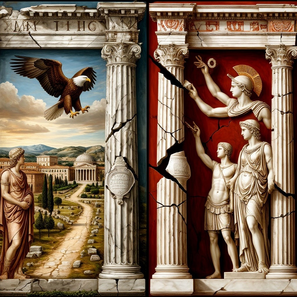 Между этими двумя светильниками лежала тень — тень грядущего кризиса. Это было не просто политическое противостояние двух государственных моделей. Это было столкновение двух фундаментальных метанарративов — всеобъемлющих систем смысла, определявших, что есть человек, общество, космос и место человека в этом космосе. Их распад стал не просто "закатом античности", а онтологическим обвалом, крушением картины мира, на обломках которой предстояло вырасти новым цивилизациям. И в этом древнем коллапсе мы с тревожным узнаванием видим черты нашей собственной эпохи.