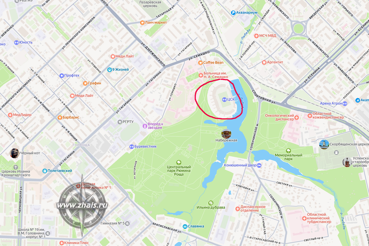 Для знакомства со следующей рязанской усадьбой у нас нет необходимости покидать пределы областного центра, поскольку она, "усадьба", располагается (располагалась) на территории городской агломерации. Нам надо лишь добраться до Центрального парка "Рюмина Роща" и повнимательнее присмотреться к стадиону ЦСК.