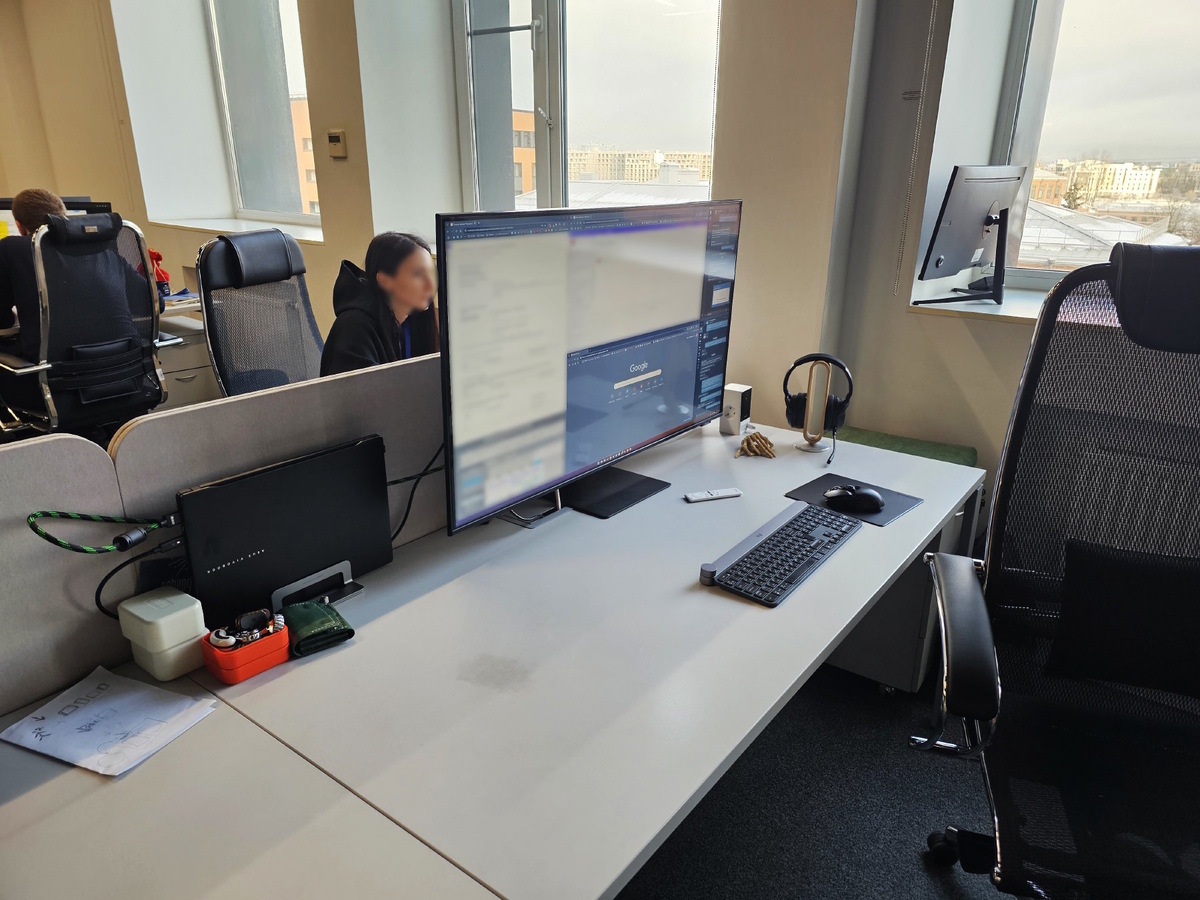 - Монитор – Samsung Smart M7 S43BM700UI размером 43 дюйма и разрешением 4К. Потому что если дома 42-дюймовый монитор, то работать за экраном ноутбука решительно невозможно. Картинка по сравнению с OLED так себе (впрочем, любая картинка так себе по сравнению с OLED), 60 герц, но как вариант для работы M7 невероятно хорош. Особенно за ₽ 20000 в состоянии б/у, которые хотят за него на известной барахолке.