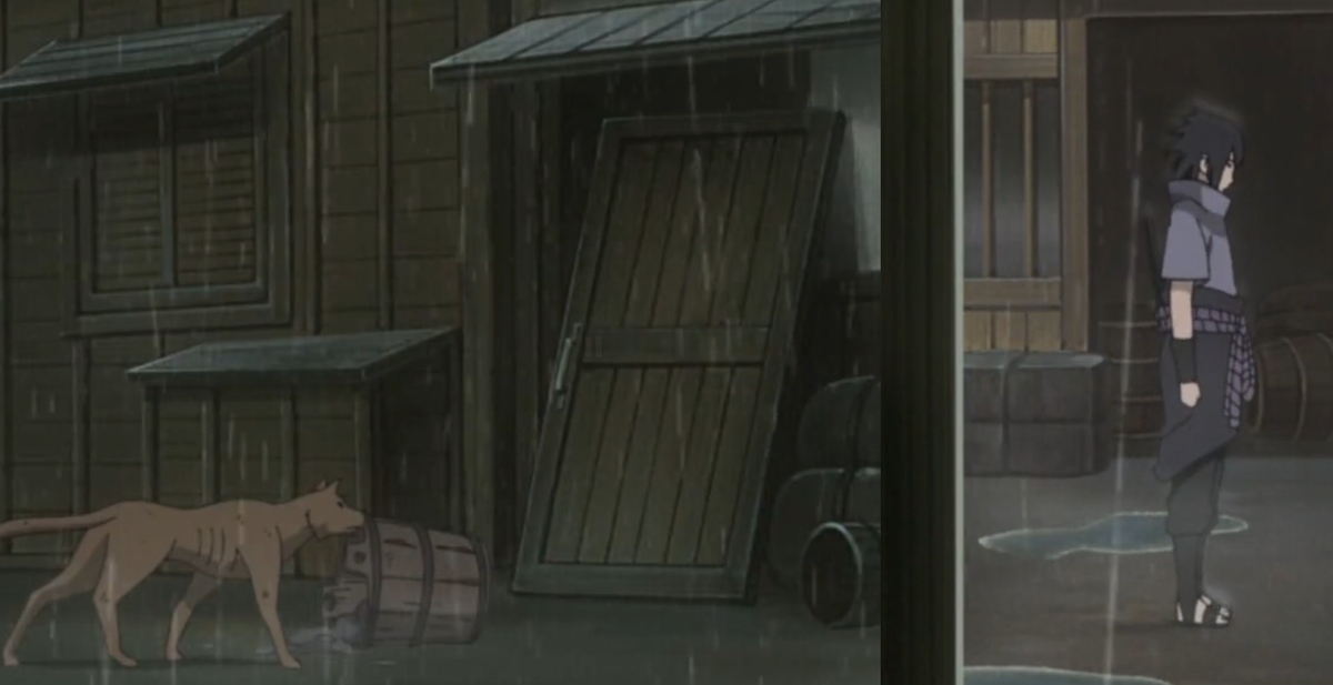 Сцена погони Саске за Итачи плавно перетекает обратно в сцену о Пятёрке Каге, перекликаясь с тем, что Итачи нужно остановить Эдо Тенсей, т.к ГЛАВНЫЙ УЖАС этой техники сейчас имеет возможность погубить лидеров Пяти Великих Деревень.