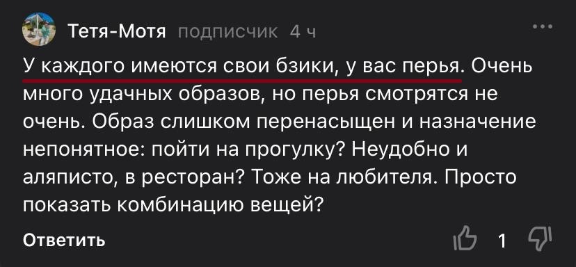 Здравствуйте, дорогие читатели! Многие мне пишут, что подписались на этот канал, как на канал о моде, а про моду тут очень мало. Так вот скажу, что вы ошиблись. Про стиль и моду - основной канал, а здесь про жизнь, возраст и всё, что с ним связано. Но почему бы не поговорить и о моде, как о части нашей жизни? Раз есть запрос, то давайте поговорим. Сегодня хочу затронуть такой давний тренд как перья на одежде и аксессуарах. Многие почему-то уверены, что они уже не в моде, ведь прошло несколько лет. Однако перья - очередное доказательство того, что мода не меняется со скоростью света. Перья были в тренде несколько лет назад, а сейчас они просто актуальны. Носим? Носим. Многие заметили, что перья я люблю. Я вообще люблю многие "экстравагантные" направления. Однако почему-то люди пишут об этом не как о моем предпочтении, а как о БЗИКЕ: Ну, бзик так бзик. Сегодня покажу образы, в которых я использовала одежду или аксессуары с перьями. И нет, это не "просто показать комбинацию вещей", а "нос