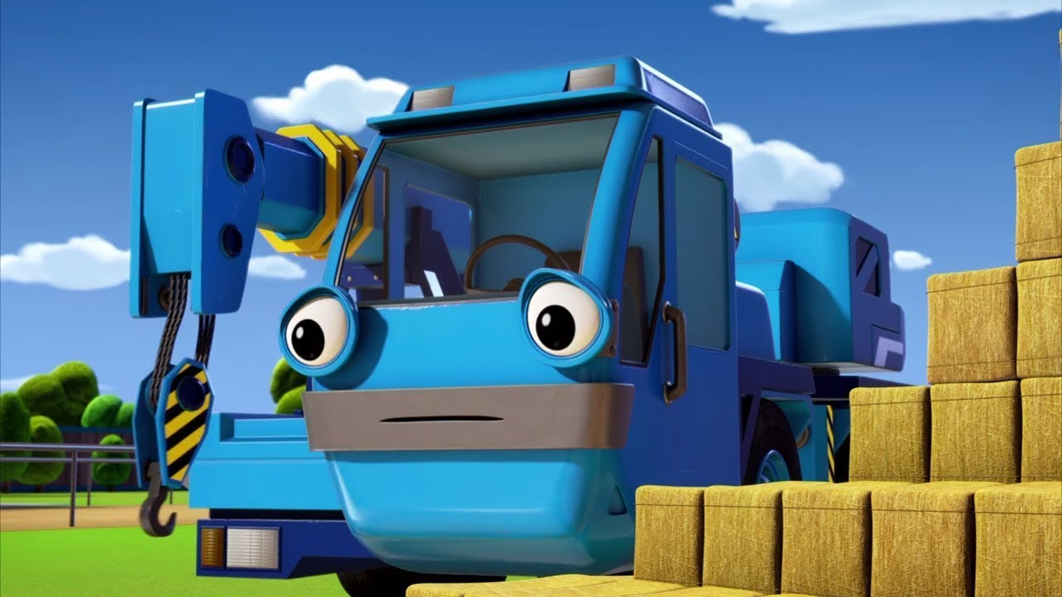 Чтобы щенок был лучше виден водителям, Лофти плавно выдвинул стрелу и аккуратно зацепил крюком за его ошейник. Лаки взмыл в воздух и повис над самой пробкой, энергично размахивая красным знаком перед машинами с одной стороны.