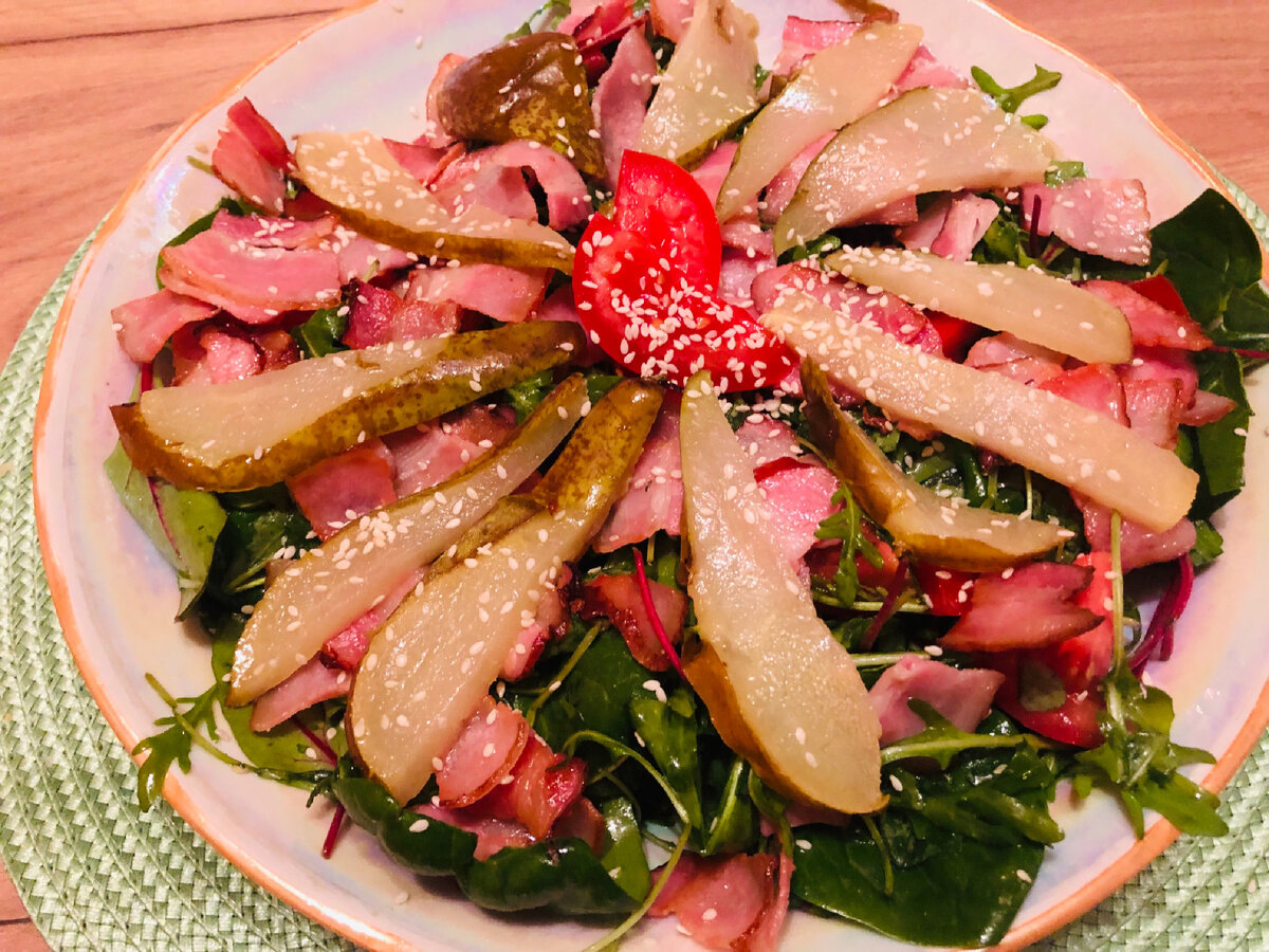 Салат на новогодний стол 2026. Рецепт с беконом, грушей и руколой