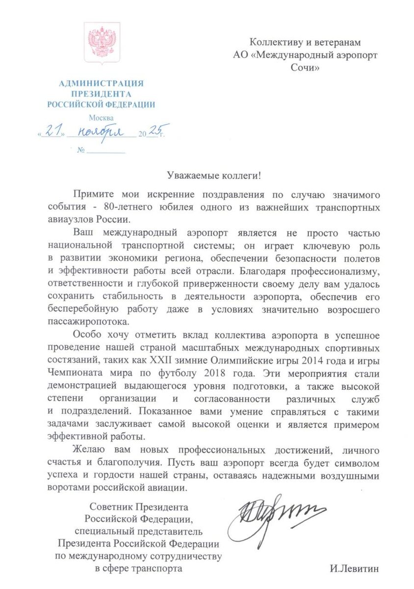 Поздравительный адрес по случаю 80-летия нам направил Советник Президента Российской Федерации, специальный представитель Президента РФ по международному сотрудничеству в сфере транспорта Игорь Левитин