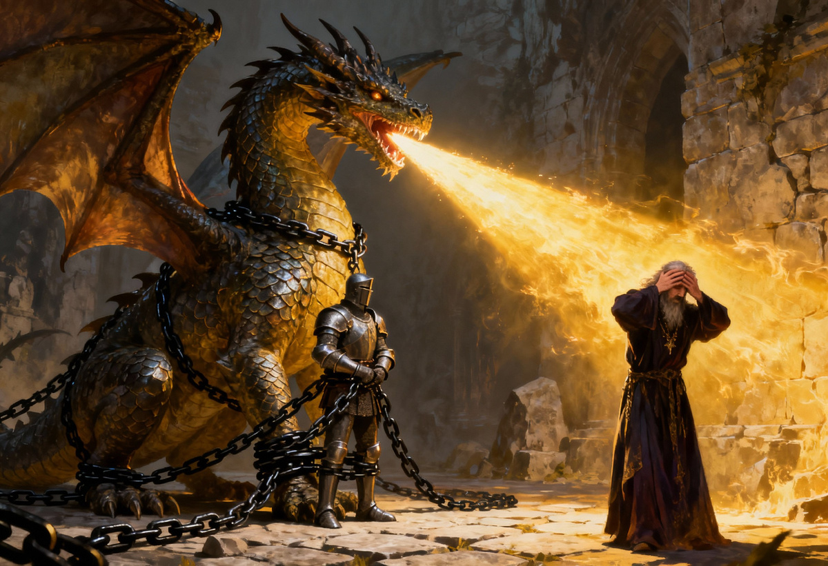 Дракон поднял голову, и волна света ударила по Моргасту, разрушая его заклятия. Колдун закричал, его тьма рассеялась, а тело превратилось в пепел, унесённый ветром.