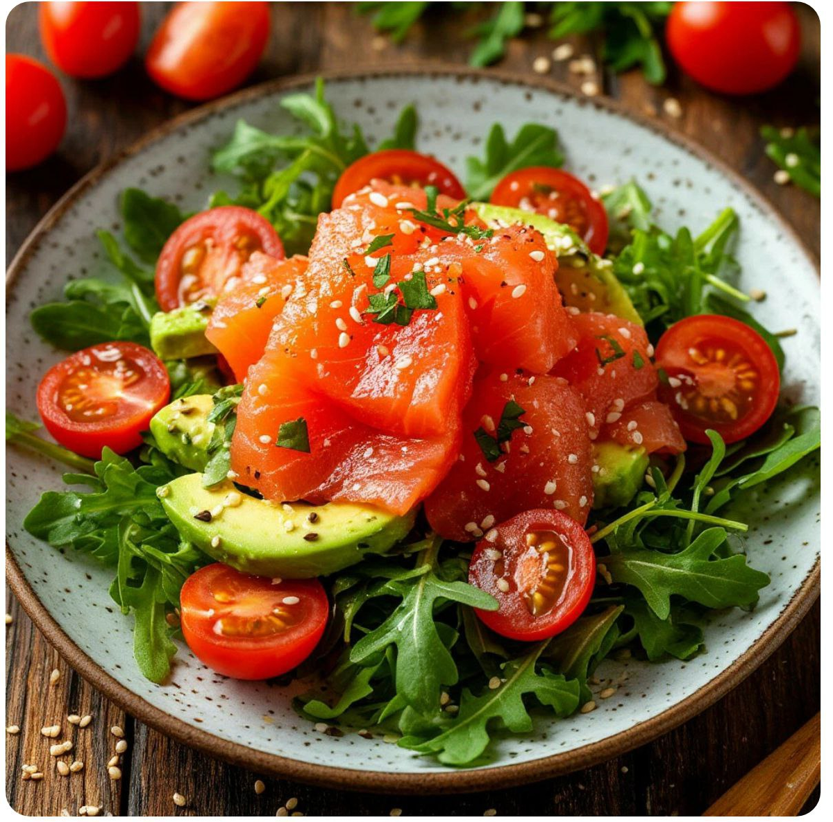 Этот салат - настоящая находка для тех, кто ценит вкусную и здоровую еду. Нежный авокадо, сочная красная рыба, пикантная рукола и сладкие помидоры черри создают идеальное сочетание, которое покорит ваши вкусовые рецепторы. Готовится он очень быстро и просто, так что вы сможете насладиться им в любой момент!