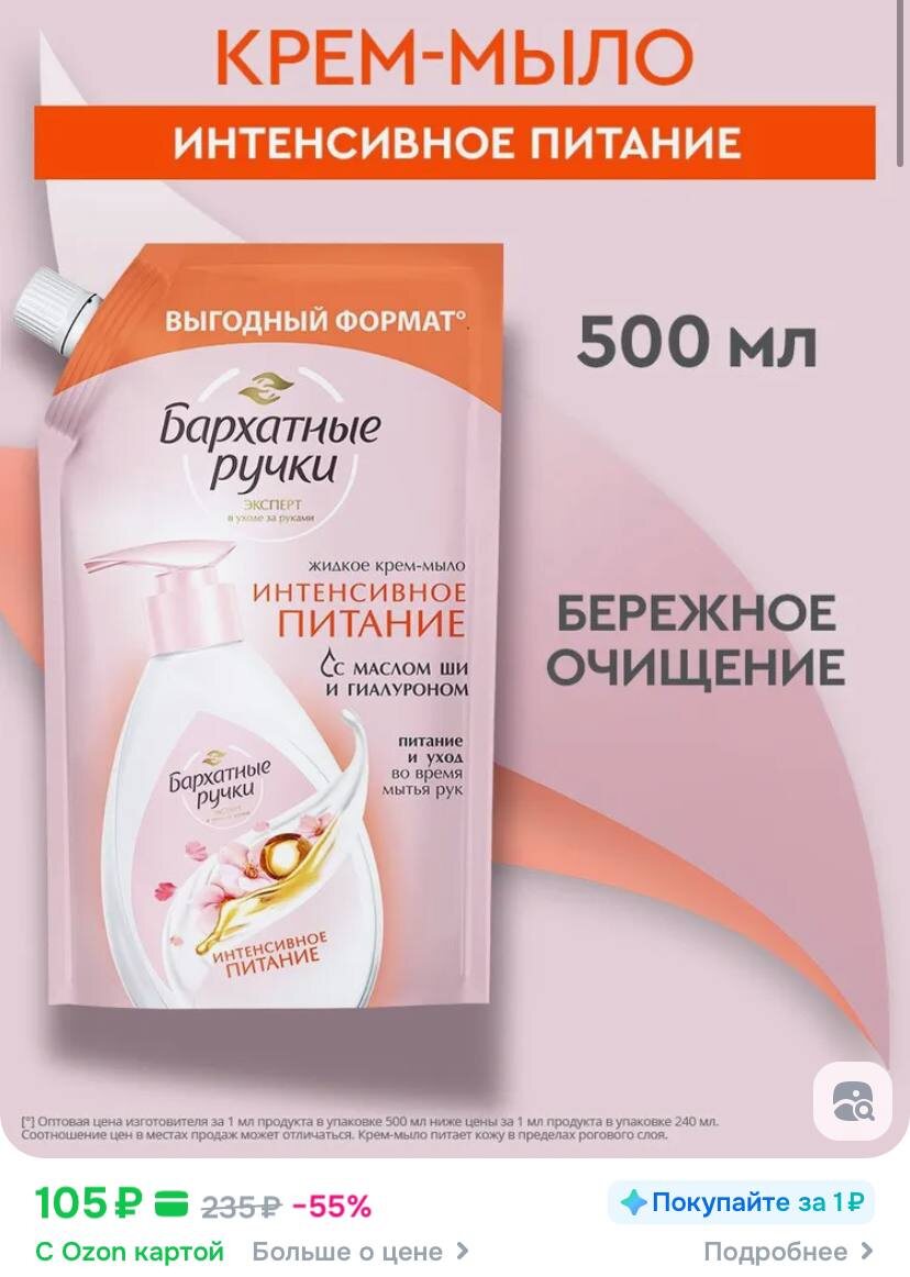 Жидкое мыло для рук Бархатные Ручки Интенсивное питание, с кремом, не сушит кожу, жидкое крем-мыло, 500 мл https://ozon.ru/t/7iH3n0x ✅ Подписаться 🔣 Бот с промокодами