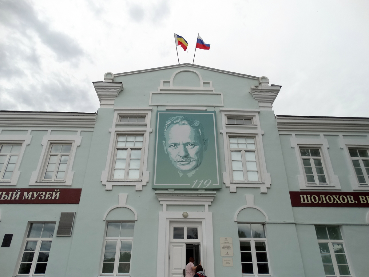 После посещения усадьбы Михаила Шолохова наш путь лежал в литературный музей, который находится недалеко от усадьбы. Пожалуй, это главное достоинство Вёшенской, что все основные достопримечательности находятся буквально в шаговой доступности друг от друга. Дойти от одной до другой не составляет труда, тем более, что дороги в центре Вёшенской очень хорошие. Однако дорога от Волгограда до Вёшенской, посещение музея в хуторе Кружилинском, а также прогулка по станице и по дому-усадьбе Шолохова сделали своё дело - к литературному музею мы подошли уже изрядно уставшими. Ноги просто гудели. По правде говоря, мне в тот момент больше хотелось не в музей, а обратно в автобус. Ну да ладно. Это всё терпимо, тем более, что не каждый день тут бываем. Историко-литературная экспозиция «М.А.Шолохов. Время и судьба» была открыта к 100-летию со дня рождения писателя. Она располагается в двухэтажном здании, в котором в 1913 году находилось станичное правление, а в 1916-1919 годах располагалась