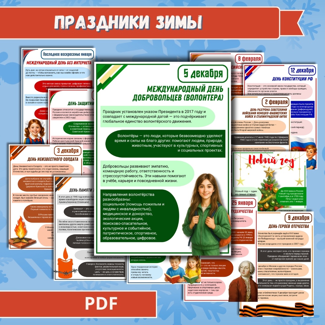 Информационные листы для стенда "Праздники и памятные даты зимы: декабря, января, февраля"