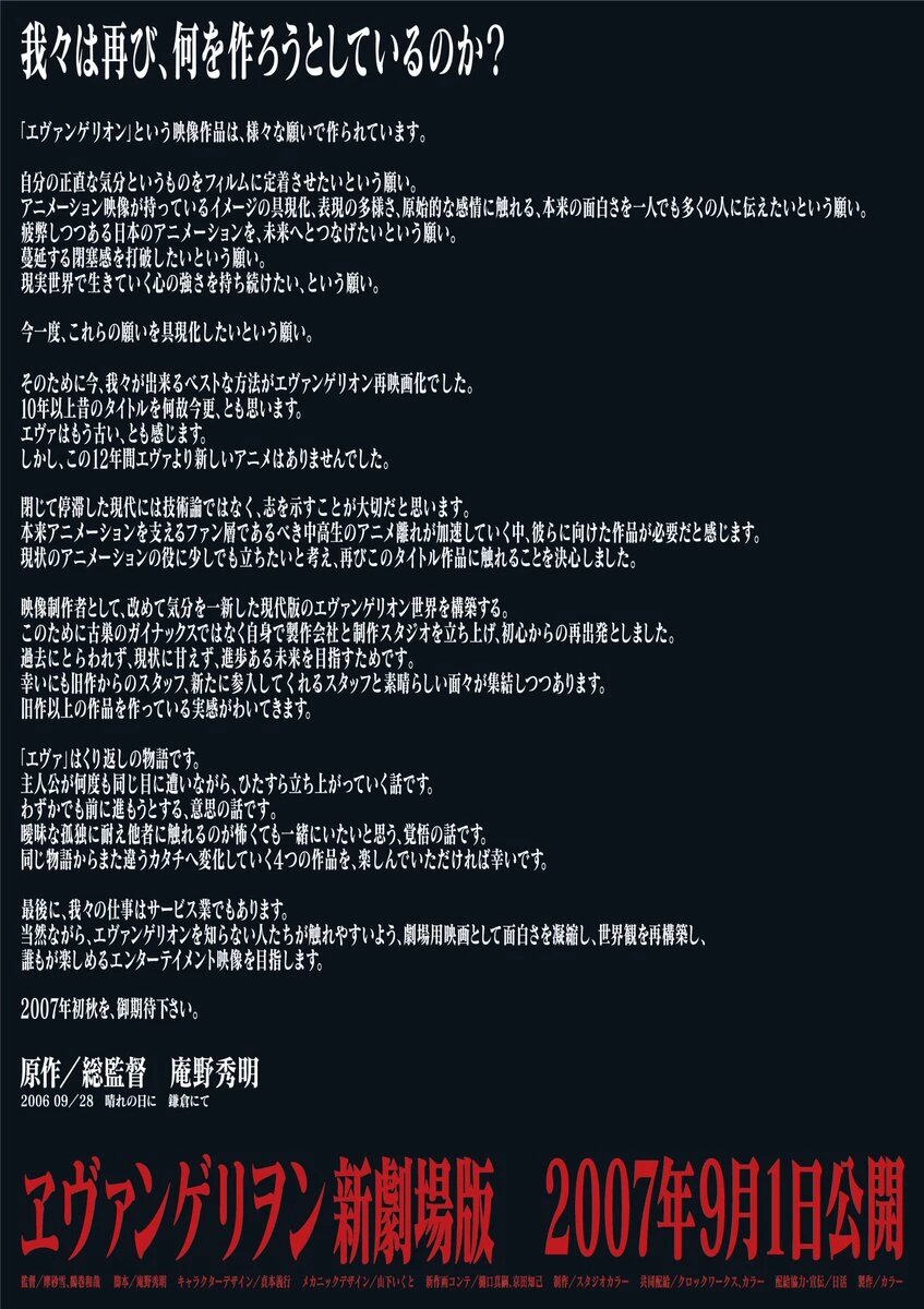 В ознаменование повторного показа серии фильмов Rebuild of Evangelion в японских кинотеатрах официальный аккаунт студии Khara X сообщил, что первоначальная концепция финала истории, предложенная режиссером Хидэаки Анно, существенно отличалась от событий финального фильма «Evangelion: 3.0+1.0 Как-то раз». На изображении ниже показана первоначальная идея Хидэаки Анно для финала «Rebuild of Evangelion», которая была разработана на этапах планирования и производства фильма. Этот документ под названием «Заметки к театральной версии EVA» был написан 20 лет назад, 20 ноября 2005 года. Вначале я представлял Rebuild of Evangelion как сборник с альтернативной концовкой. Эпизоды с 20-го и далее аниме будут переработаны с учетом нового финала. Финал в самом раннем черновом варианте сюжета включает в себя противостояние между EVA Каору и Синдзи. Кульминацией становится прощение Синдзи Каору после того, как последний убил Гэндо Икари, слившегося с Аской и Адамами, а также Евой-02. После множества не