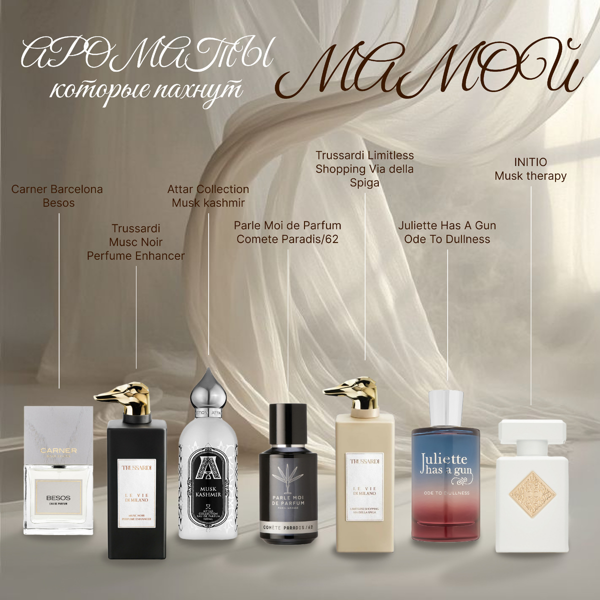 Это нежный, уютный аромат с акцентом на пудру, белый крем и едва уловимую цитрусовую свежесть. Он окутывает, как лёгкое прикосновение к чистой коже — тонкий и почти шепчущий. Название говорит само за себя — Besos звучит как поцелуи: тёплые, бережные. Он не привлекает к себе внимания громко, но оставляет после себя впечатление нежности и заботы. Хочу попробовать✅ Мягкий, уютный аромат, словно тёплые объятия или кожа после душа. Спокойный, домашний, с нежным сочетанием мускуса, ириса и жасмина. Он звучит телесно и натурально, как будто это просто твой собственный запах. Хочу попробовать✅ Аромат, вдохновлённый атмосферой региона Кашмир, известного своими роскошными и экзотическими ароматами. В основе — лёгкий, чистый белый мускус, окутывающий мягкой вуалью. Его дополняет нежная гардения, придающая аромату сливочную гладкость и лёгкий цветочный штрих. Аромат звучит деликатно: без ярких всплесков, без резких углов. Он про тишину, баланс и внутреннее спокойствие. Хочу попробовать✅ Тепло, н