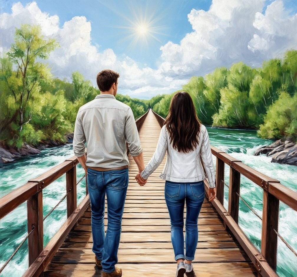 Видимый бурлящий поток между тонких дощечек может символизировать внутренний поток жизни с его непредсказуемыми силами: эмоции, требования к адаптации, давление ожиданий. Шаг на мост — символ решения принять перемены, рискнуть, но с осознанием того, что плавность и безопасность сюжета не гарантируется.