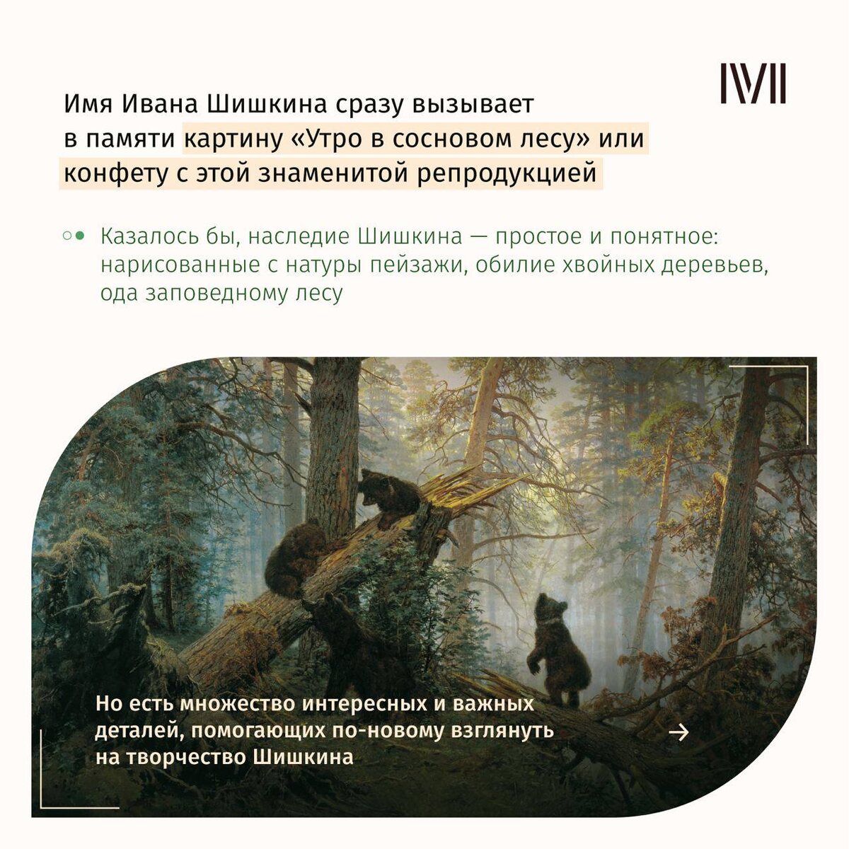 «Добросовестный убежденный искатель правды» — такую характеристику дал Ивану Шишкину художник, коллекционер и эстет Александр Бенуа. Сразу же можно представить идиллическую картину: знаменитый пейзажист изображает с натуры летнюю лесную поляну, с любовью выделяя каждую травинку и еловую ветку. Конечно же, все было не так: Шишкин — человек, переживший много тяжелых событий. Он потерял двух маленьких сыновей и жену, после чего женился второй раз на своей ученице, которая через год погибла в родах. Его интересовала наука: он общался с Дмитрием Менделеевым, изучал технические новшества и поощрял студентов пользоваться ими. Он входил в число первых членов отдела светописи Русского технического общества. Другие подробности творческого метода Ивана Шишкина (в том числе и процесс создания лесных пейзажей) — в карточках, подготовленных по мотивам онлайн-курса «Русские вопросы: о чём говорят с нами художники XIX века» искусствоведа Елены Якимович.
