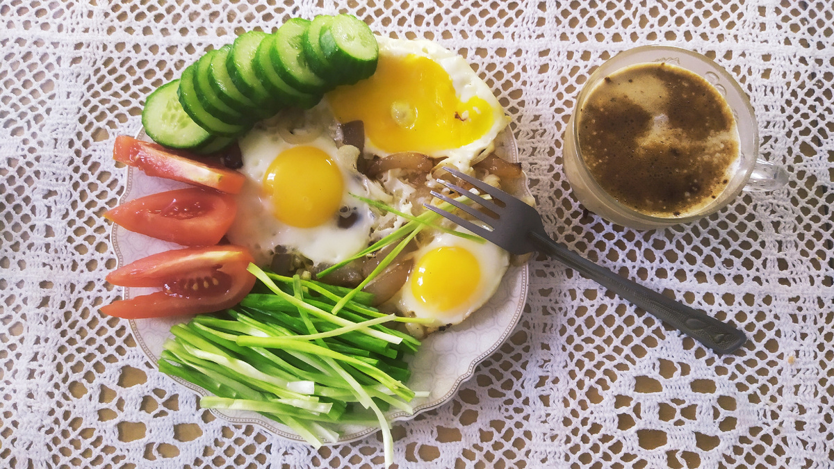Не смотря на то,что я сейчас работаю и могу позволить купить себе, что-то вкусное,я всё равно стараюсь экономить .Я люблю простую деревенскую пищу. 😋 Сегодня я выходная и с утра на завтрак я решила побаловать себя любимую яичницей,пожарила её с салом и репчатым луком.Боже это так вкусно и полезно . Порезала огурчик, помидор и срезала своего зелёного лука.О да яйца у меня тоже свои,от домашних кур.Кур мы водим постоянно ,выводим их ежегодно в инкубаторе. 😘 Но и конечно моё утро никогда не обходится без кофе.Недавно я открыла для себя необычное приготовление кофе и очень вкусное, влюбилась и подсела на него. В чашку наливаю молоко и подогреваю в микроволновке , пока молоко греется в другую чашку насыпаю чайную ложку кофе,добавляю чуть-чуть горячей воды и взбиваю автоматическим венчиком до образования пенки,добавляю горячее молоко и наслаждаюсь вкуснейшим напитком.Кофе я пью без сахара уже много лет.Но вы можете добавить при взбивании. Когда я перед выходными шла с работы домой, зашла